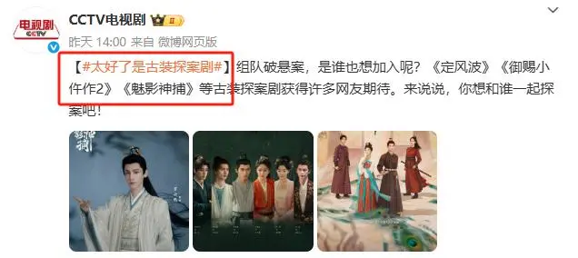 这不泸深配,就在近日,CCTV电视剧专门发布了一条介绍:“太好了是古装探案剧”。